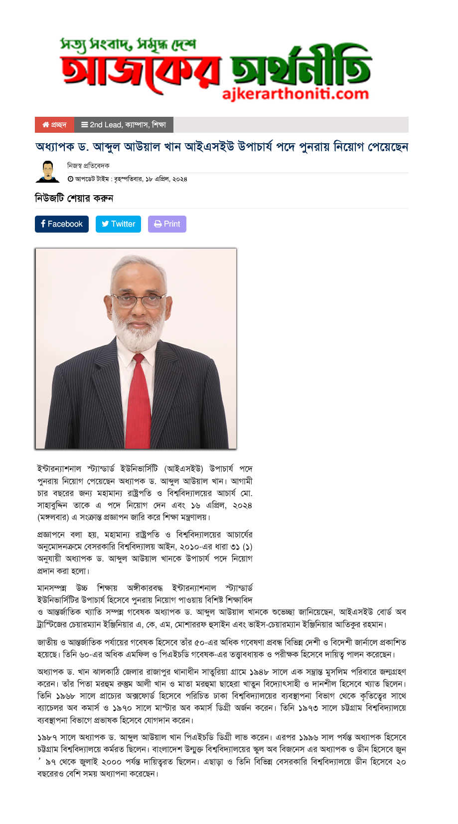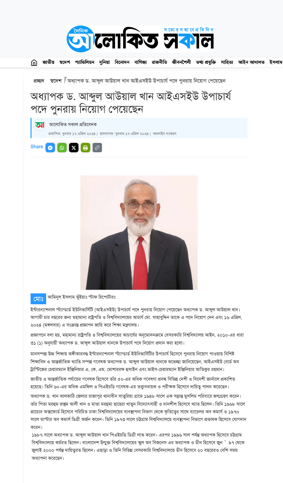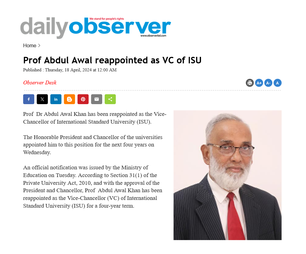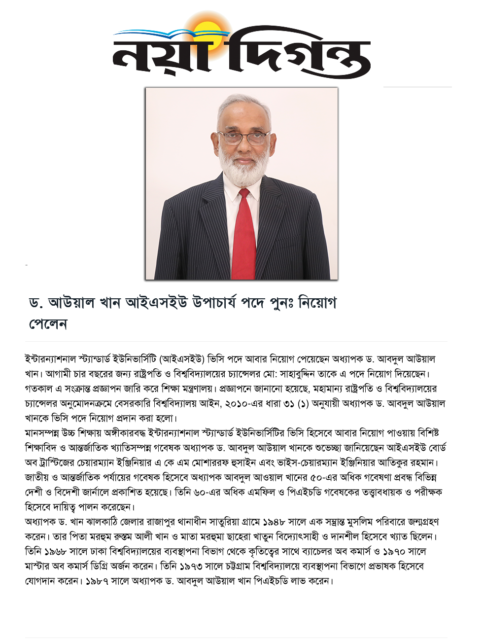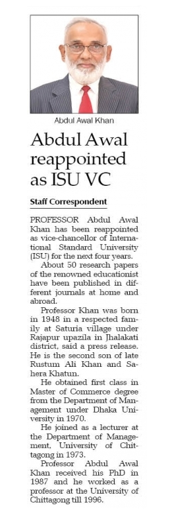আইএসইউর উপাচার্য পদে পুনর্নিয়োগ পেলেন আব্দুল আউয়াল খান