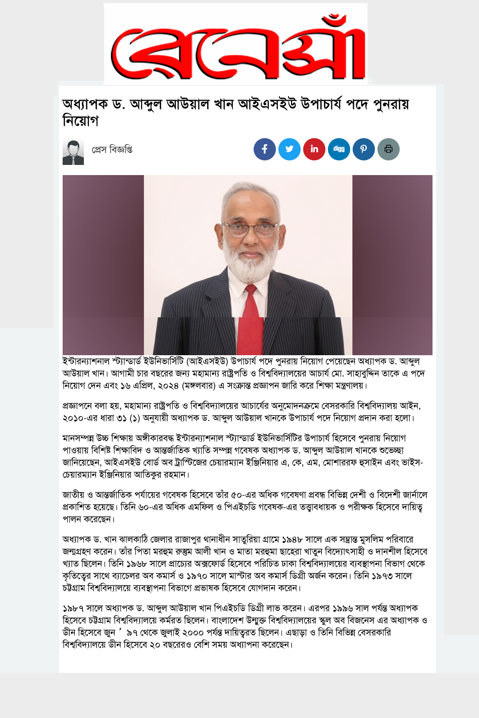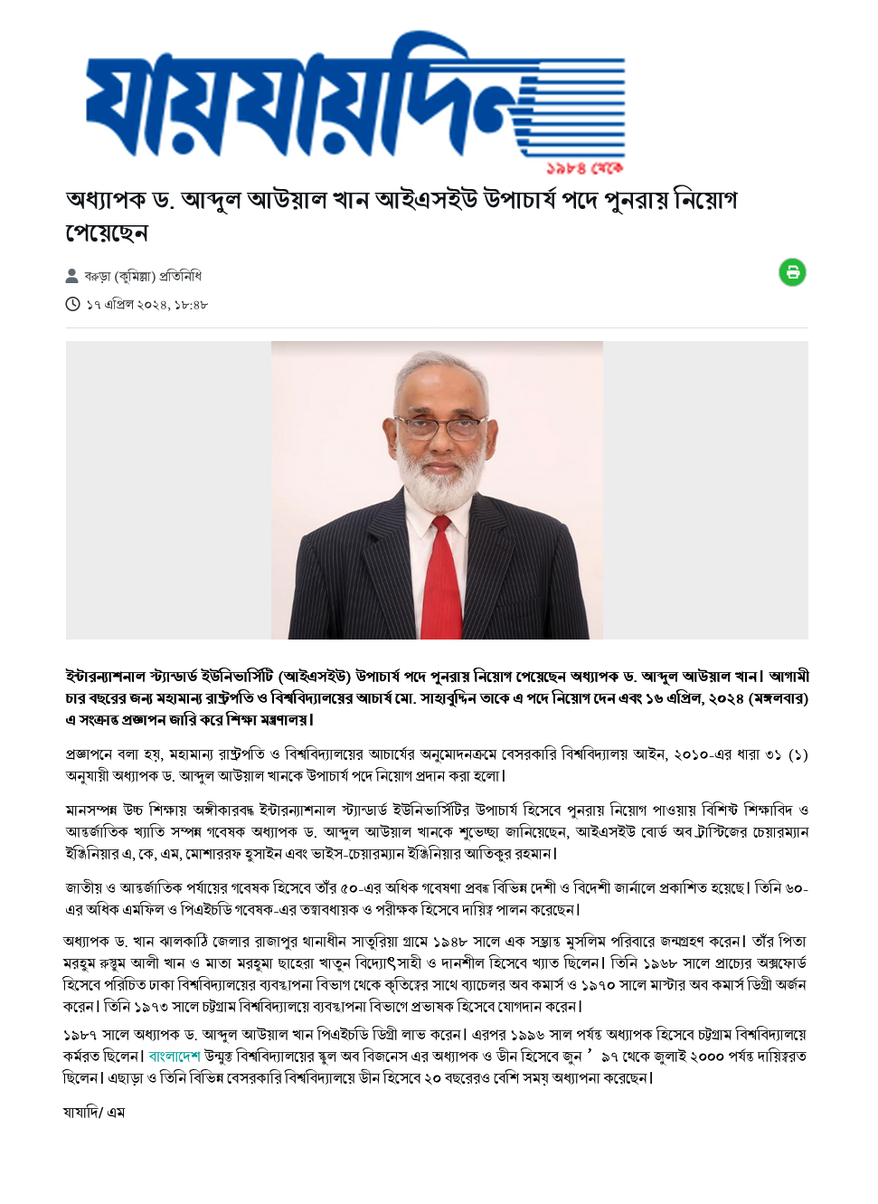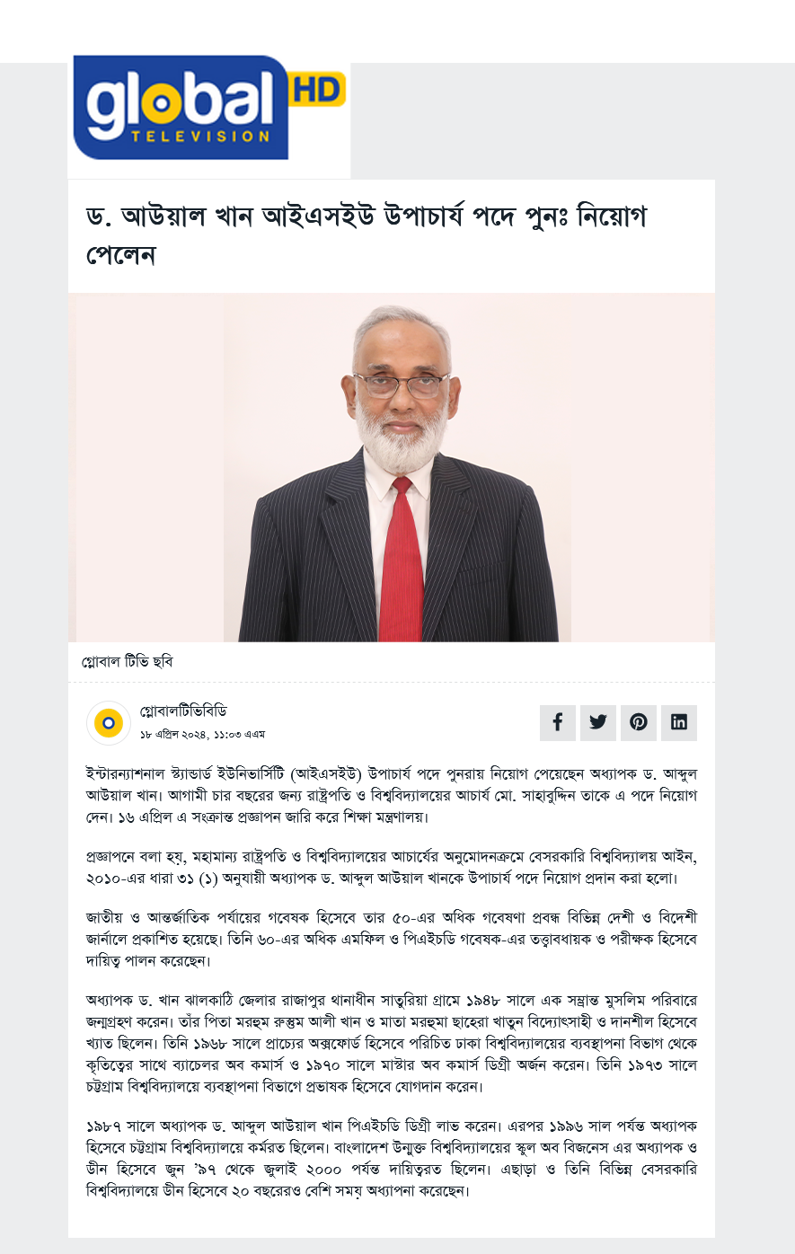 আইএসইউর উপাচার্য পদে পুনর্নিয়োগ পেলেন আব্দুল আউয়াল খান